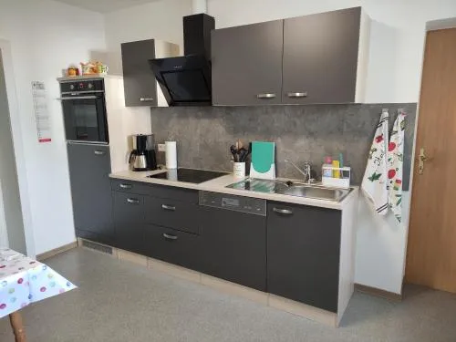 More information about Ferienhaus BuschFerienwohnung Am Lindenbaum in Kirnitzschtal provides a two-bedroom apartment with a sun terrace and garden, ideal for families seeking comfort and space. The unit includes modern facilities like a kitchenette equipped with a coffee maker, dishwasher, and oven, along with a dining area and living room featuring flat-screen television.